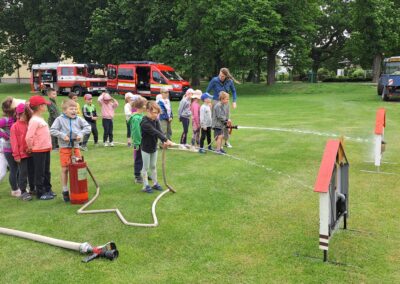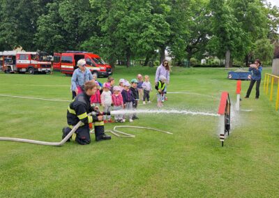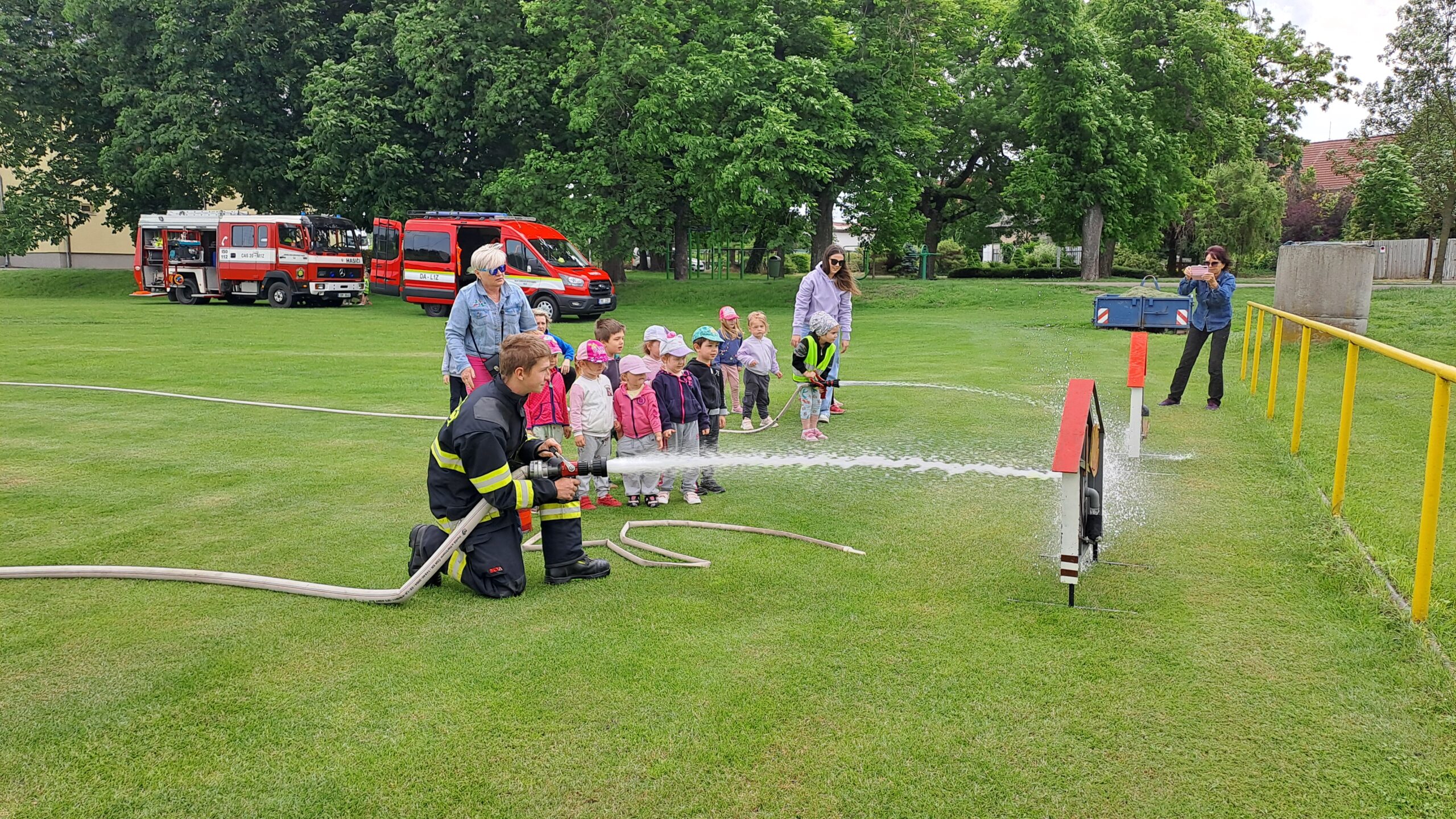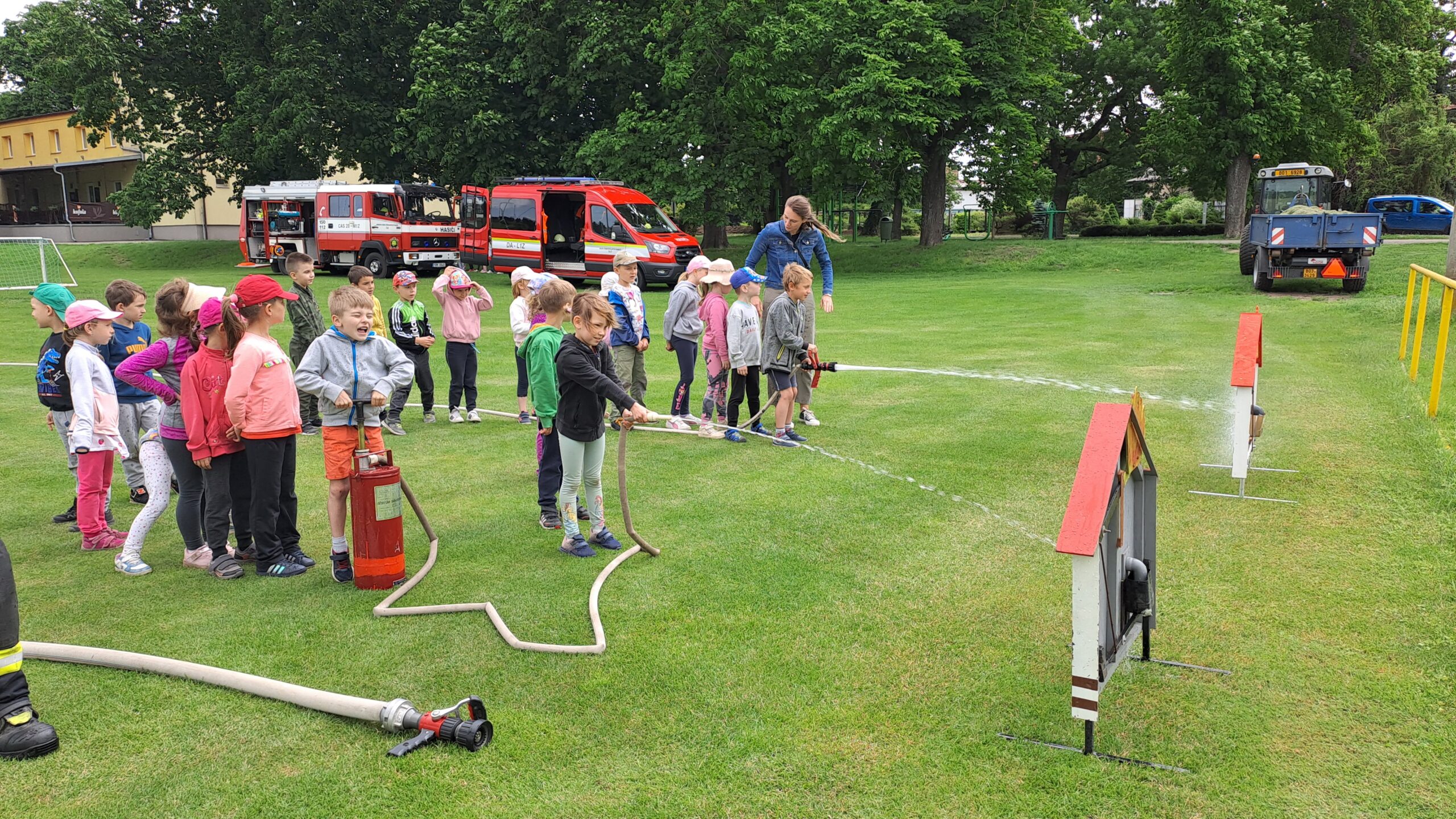 Skvělou aktivitou byla i simulace hašení domečků. Jeden malý hasič pumpoval vodu a druhý mířil hadicí na terč v podobě otvoru. A jak se ukázalo, týmová práce je klíčem k úspěchu i v předškolním věku.