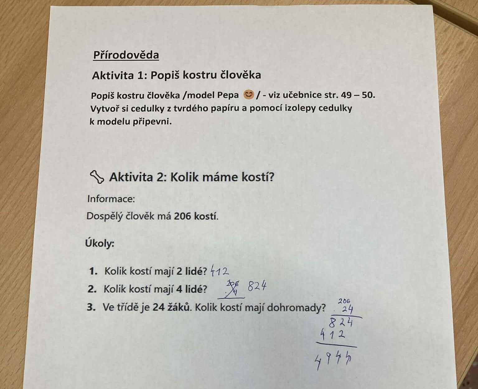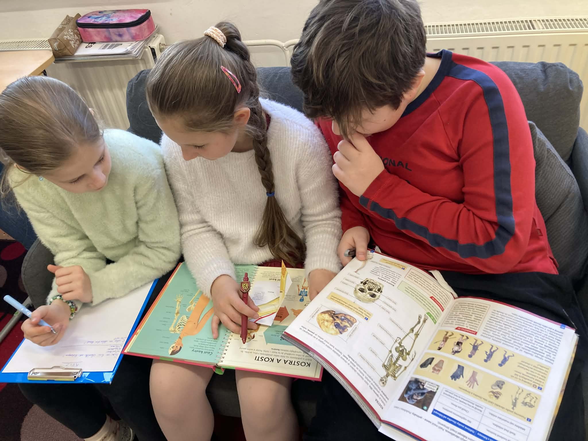 Žáci 5. třídy se během celodenního projektového dne věnovali tématu kostra člověka. Učení probíhalo formou čtyř center aktivit, kde si děti ve skupinách vyzkoušely různé úkoly propojující několik školních předmětů.