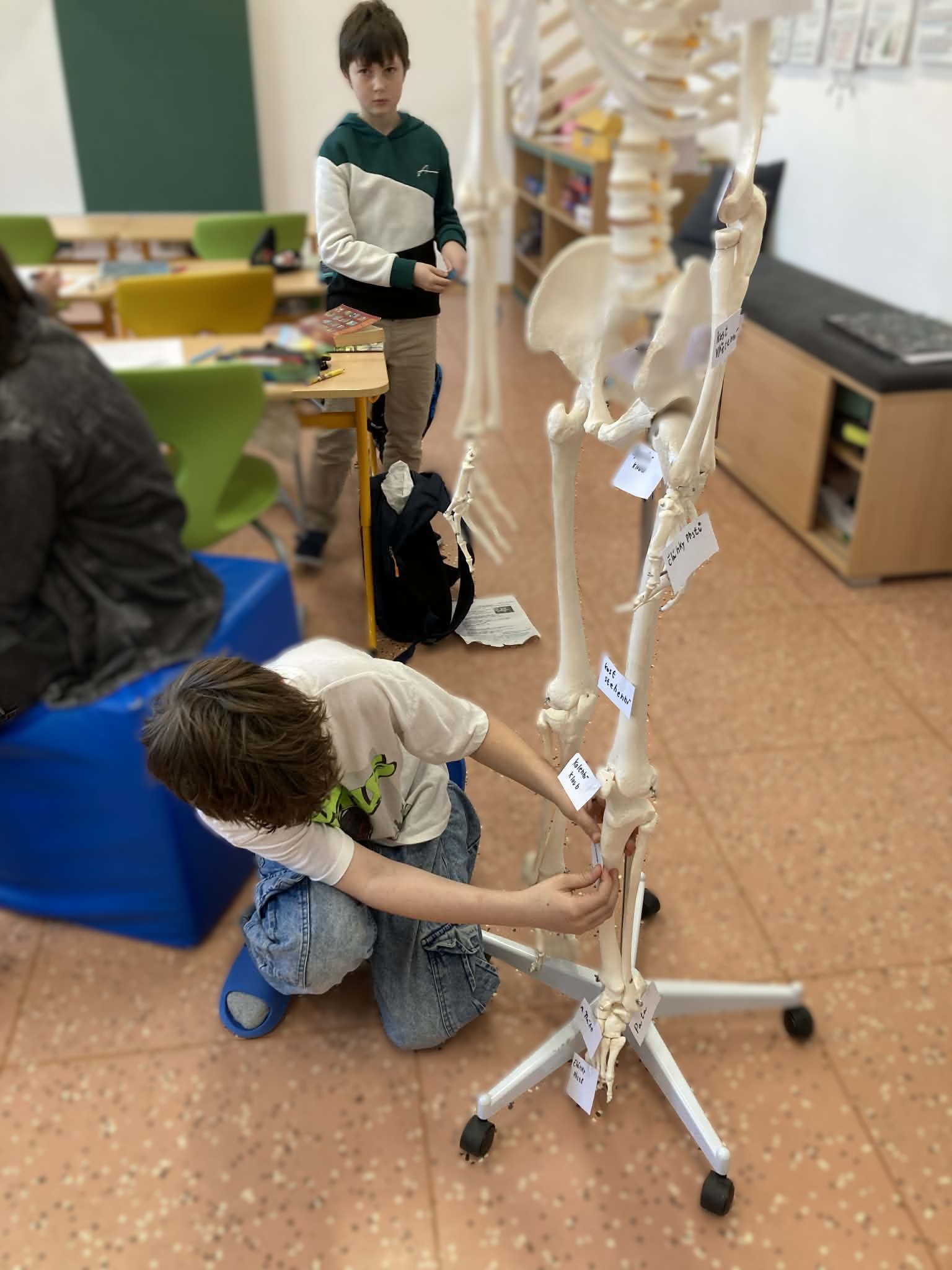 V centru přírodovědy pracovali žáci s modelem lidské kostry. Jejich úkolem bylo zjistit význam kostry a správně pojmenovat její jednotlivé části. Vytvořili cedulky s názvy a připevnili je na správná místa. Poté ostatním spolužákům vysvětlili, jaké části kostry poznali a k čemu v těle slouží.