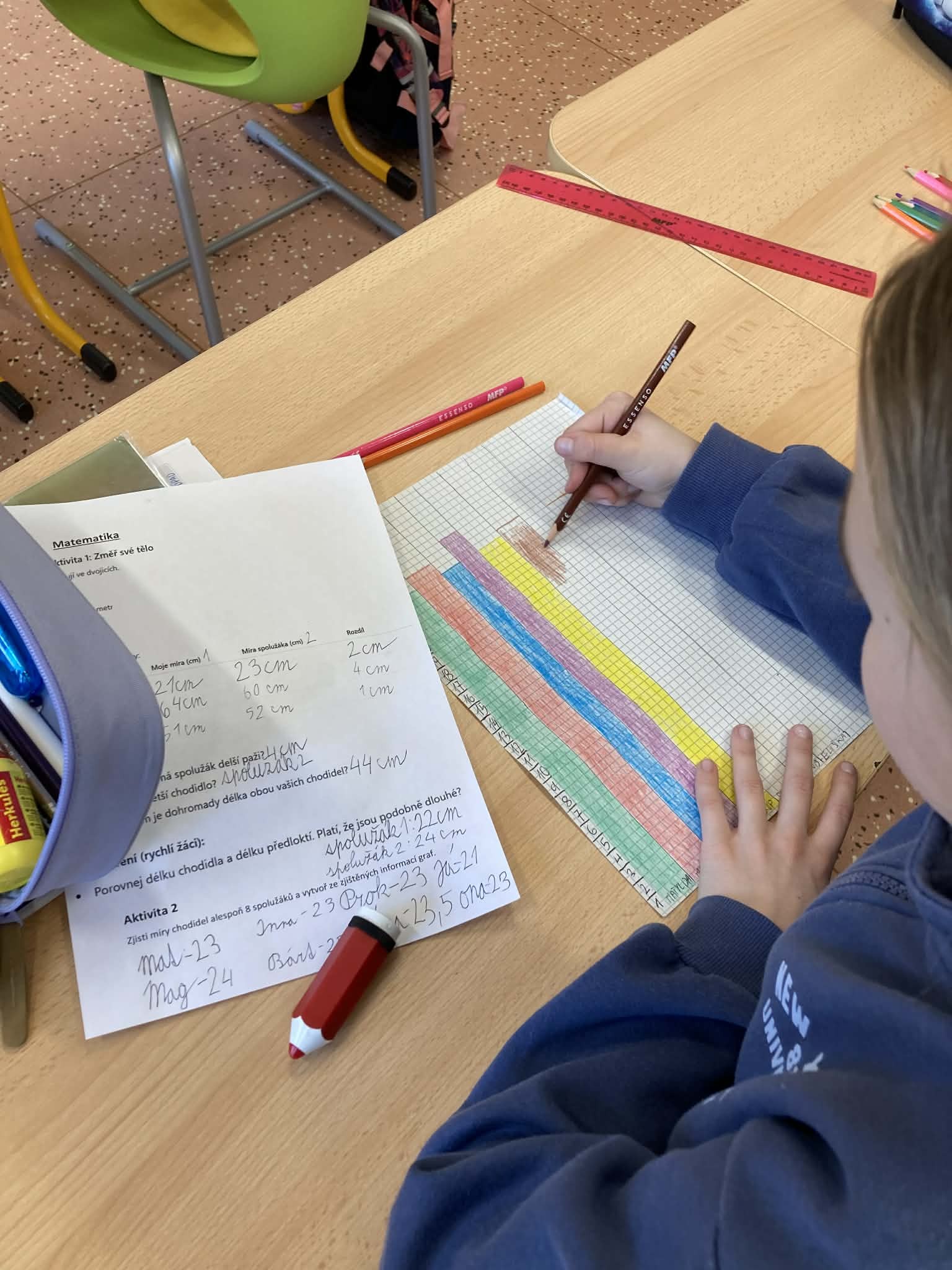V centru matematiky se děti pustily do měření. Navzájem si měřily obvod hlavy, paže a velikost chodidla. Z naměřených hodnot poté společně vytvořily graf, ve kterém porovnaly získané výsledky a zjistily, jak se jednotlivé míry ve třídě liší.