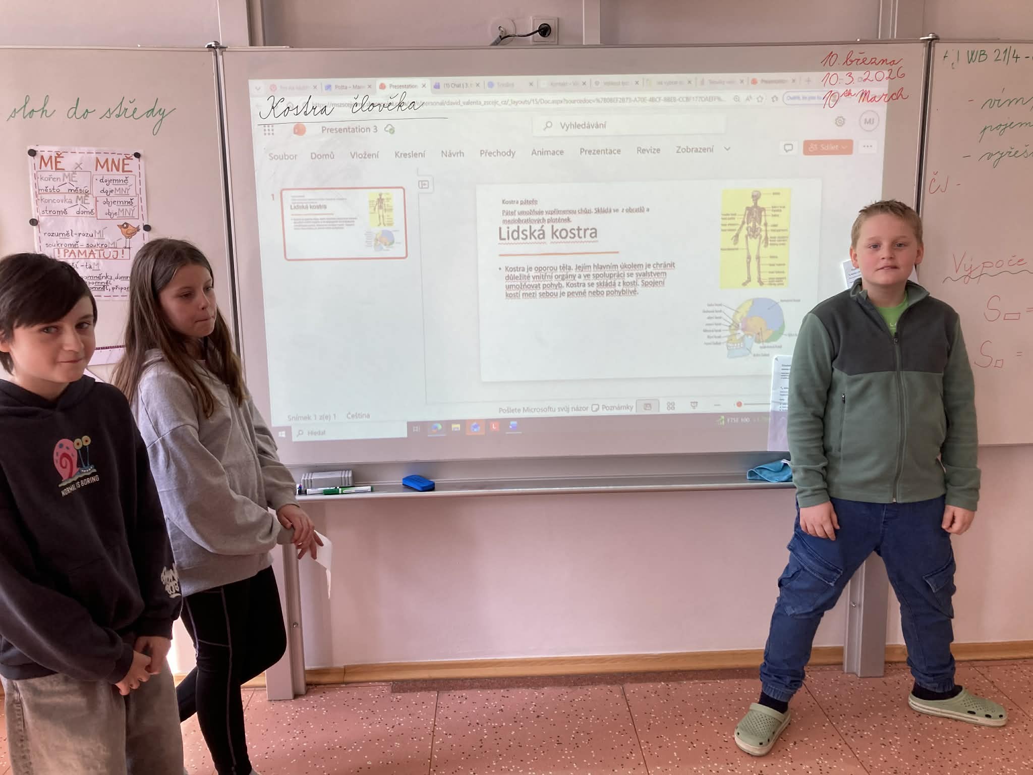 V centru informatiky žáci vytvářeli prezentaci o lidské kostře, která bude zároveň sloužit jako zápis do sešitu pro ostatní spolužáky. Soustředili se především na nejdůležitější informace a doplnili je vhodnými obrázky, aby byl výsledný materiál přehledný a srozumitelný.